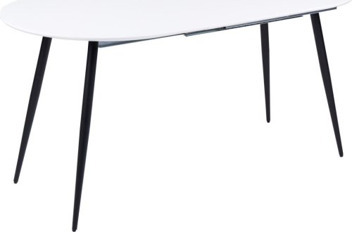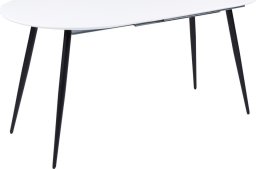 Stół ma nowoczesny styl, jest dostępny w kolorze białym, wykonany z przetworzonego drewna, głównym materiałem jest MDF, a dodatkowym materiałem jest stal. Nogi stołu są metalowe, a powierzchnia blatu to przetworzone drewno. Stół ma owalny kształt i jest wykończony proszkowo.