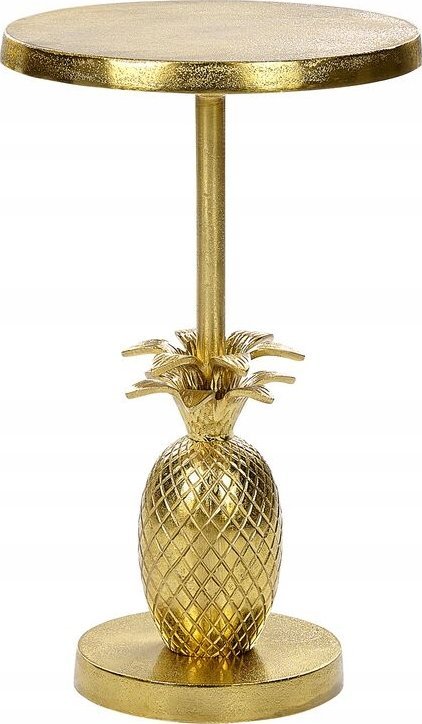 Stolik pomocniczy Beliani PANNOUVRE to stylowy mebel, który doskonale wzbogaci wystrój każdego wnętrza. Jego smukła noga, ozdobiona rzeźbą w kształcie ananasa, nadaje mu niepowtarzalny charakter i przyciąga wzrok. Wykonany z solidnego metalu w kolorze złotym, stolik łączy nowoczesny design z funkcjonalnością, co czyni go idealnym dodatkiem do różnych stylów aranżacyjnych.