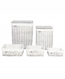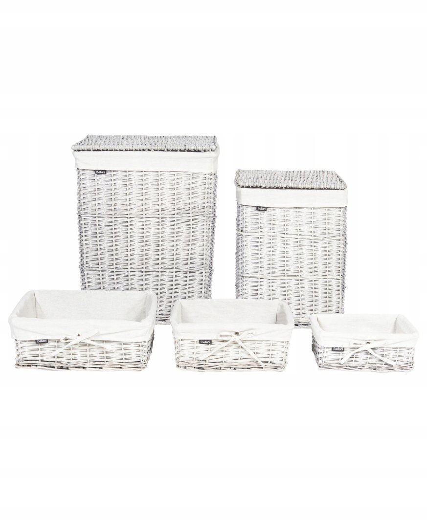 Zestaw pięciu koszy wiklinowych ELLA to stylowy i praktyczny element, który doskonale wpasuje się w każde wnętrze. Te ręcznie robione kosze z naturalnej wikliny dodają wyjątkowego charakteru każdemu pomieszczeniu. W skład zestawu wchodzą trzy mniejsze kosze oraz dwa większe, które idealnie nadają się do przechowywania prania. Każdy z koszy jest wyposażony w pokrywkę oraz wyjmowaną podszewkę z tkaniny, co znacznie ułatwia dbanie o ich czystość.