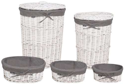 Zestaw pięciu koszy wiklinowych VAKARI to doskonałe połączenie elegancji i praktyczności, które wprowadzi naturalny urok do każdego wnętrza. Ręcznie wykonane kosze wyróżniają się unikalnym stylem, a ich estetyka sprawia, że idealnie wpasują się w różnorodne aranżacje. W skład zestawu wchodzą dwa większe kosze na pranie z pokrywkami oraz trzy mniejsze, które świetnie nadają się do przechowywania różnych drobiazgów.