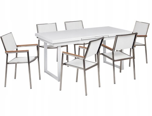 Zestaw ogrodowy VALCANETTO/GROSSETO od marki Beliani to znakomity wybór dla tych, którzy pragną połączyć komfort z elegancją podczas letnich spotkań. Składający się z rozkładanego stołu oraz sześciu krzeseł, ten zestaw idealnie nadaje się do organizacji większych posiłków na świeżym powietrzu. Dzięki nowoczesnemu wzornictwu i stonowanej kolorystyce, meble te harmonijnie wkomponują się w różnorodne aranżacje ogrodowe.