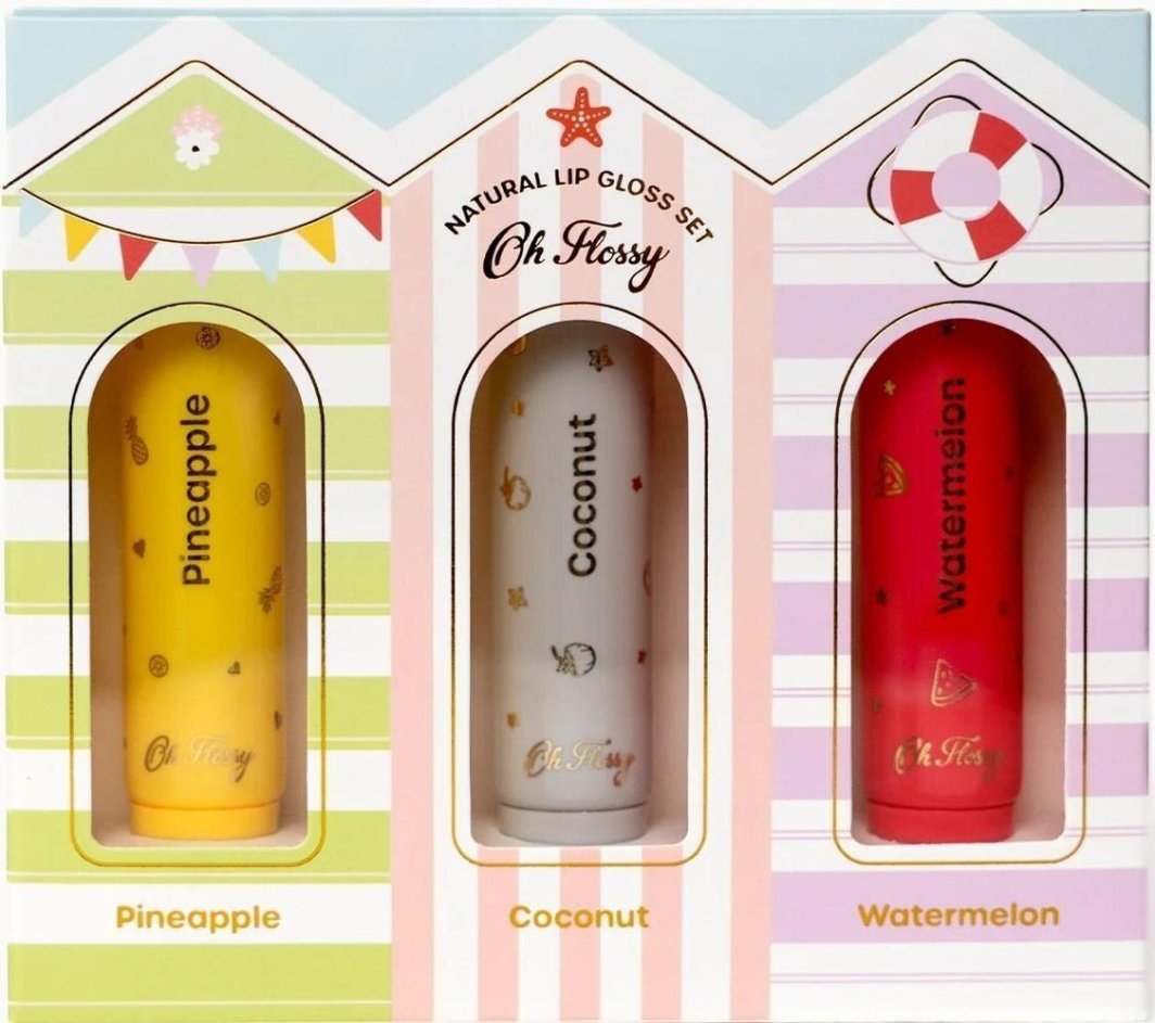 Oh Flossy oferuje zestaw błyszczyków stworzony z myślą o delikatnych ustach dzieci. Zawiera trzy smakowite warianty - Ananas, Kokos i arbuz- wykonane wyłącznie z naturalnych składników, takich jak woski roślinne i olejki, które nawilżają i chronią usta przed wysuszeniem. Każdy błyszczyk jest łatwy w aplikacji, nie klei się i ma słodki owocowy aromat. Produkt wegański, biodegradowalny i bezpieczny nawet dla najmłodszych. Dzieci pokochają ten zdrowy blask i owocowe smaki! - ręcznie wykonane w Australii, wyłącznie z naturalnych, biodegradowalnych i wegańskich składników.