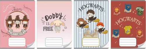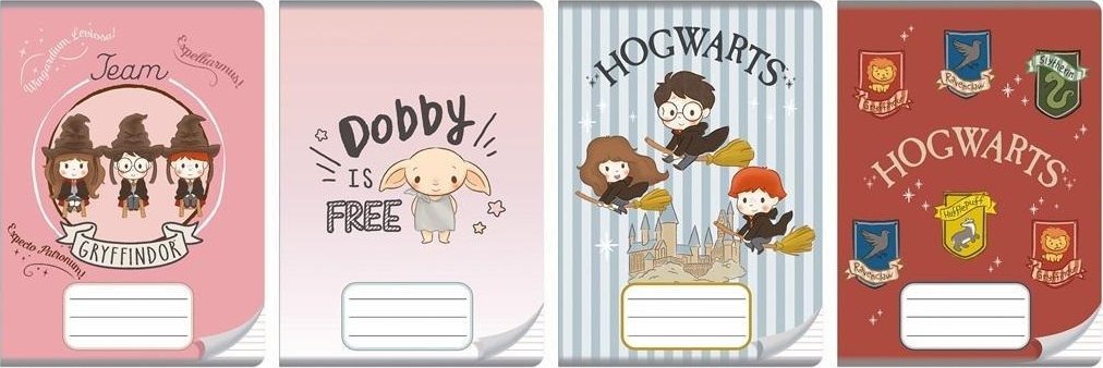 Zeszyt A5, posiada 16 kartek o gramaturze 70 g/m2 w 3 kolorowe linie. Charakteryzuje się estetycznym, lakierowanym wykończeniem i okładką z serii Harry Potter. Na zewnętrznej stronie okładki: imiennik - miejsce na wpisanie imienia, nazwiska, klasy.