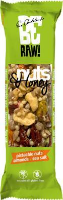 Mocno orzechowy baton z miodem, pistacjami, migdałami i solą morską. Bez oleju palmowego, syropu glukozowo-fruktozowego, z naturalnymi składnikami, bez glutenu.