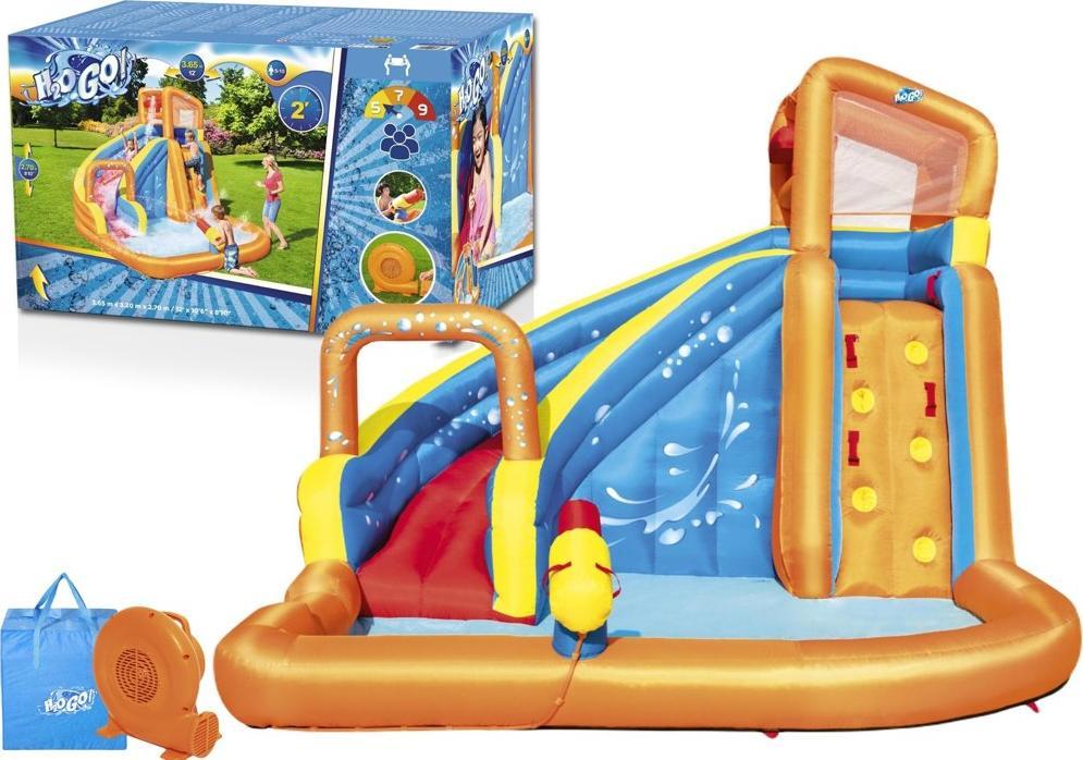 | Świetna zabawa w wodzie i niezwykle udane przyjęcia urodzinowe - basen dla dzieci H2OGO! Turbo Splash firmy Bestway Park wodny Bestway zapewnia fantastyczną zabawę wszystkim dzieciom w wieku od 5 do 10 lat, które lubią się pluskać w wodzie. Dmuchany plac zabaw składa się ze zjeżdżalni wodnej, ścianki wspinaczkowej i basenu. Zjeżdżalnia zaopatrzona jest w specjalny mechanizm, który polewa ją wodą, dlatego zjeżdżać można bez przerwy. Aby dzieci były bezpieczne, wieża zjeżdżalni otoczona jest siatką ochronną. Plac zabaw zaopatrzono również w armatkę wodną. Basen dla dzieci został wykonany z wytrzymałego poliestru z powłoką PCW. Dzięki wydajnej, wbudowanej pompie-dmuchawie z certyfikatem GS (220-240 V/520 W), montaż basenu nie zabierze więcej niż 2 minuty. Basen jest przeznaczony wyłącznie do użytku na zewnątrz. Dołączono do niego między innymi wąż do wody, kotwicę, zestaw śledzi, torbę do przechowywania i samoprzylepną łatkę naprawczą. Zarówno na zjeżdżalni, jak i na ściance wspinaczkowej, może przebywać jedna osoba na raz, brodzik natomiast nadaje się dla 5 osób. Maksymalna wysokość to 142 cm, a długość spadku zjeżdżalni to 192 cm. Park wodny przeznaczony jest dla osób mierzących maksymalnie 152 cm wzrostu, jego maksymalne obciążenie to 270 kg. | ![]() |