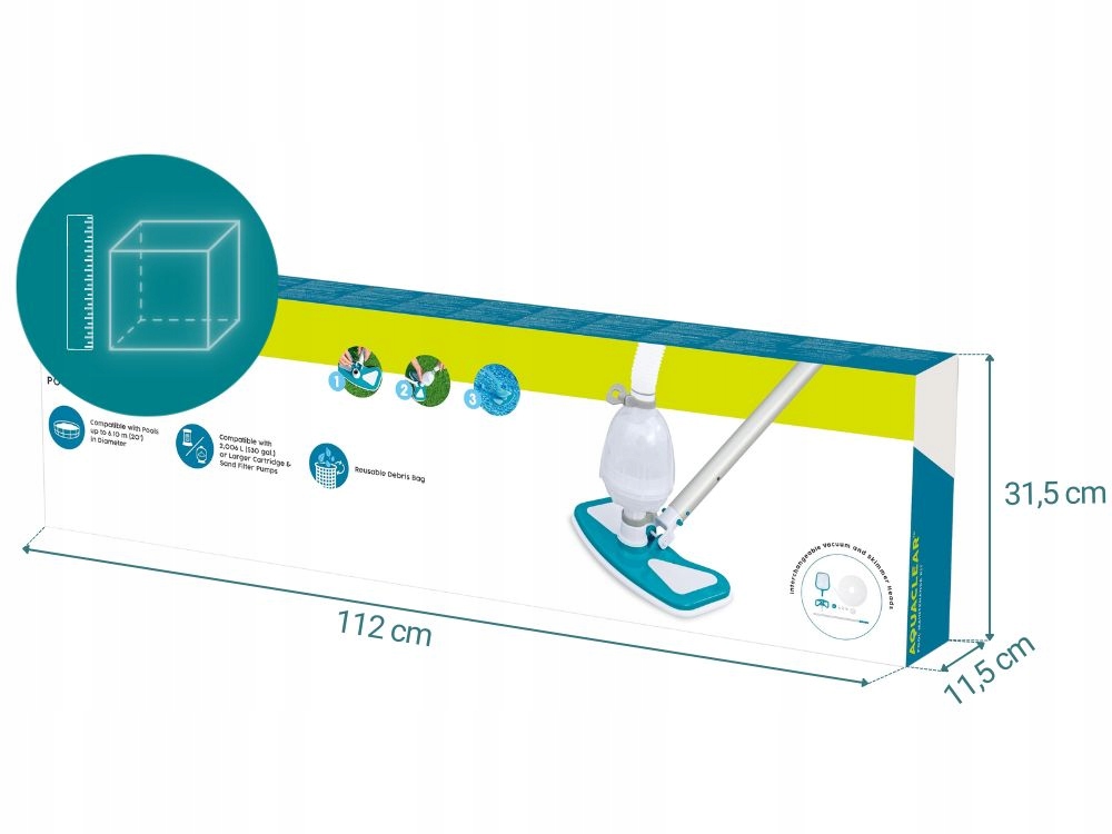 Regularne stosowanie odkurzacza pozwala ograniczyć ilość zużywanej chemii basenowej oraz częstotliwość wymieniania wody w basenie. Zalecany do basenów o średnicy do 610 cm.