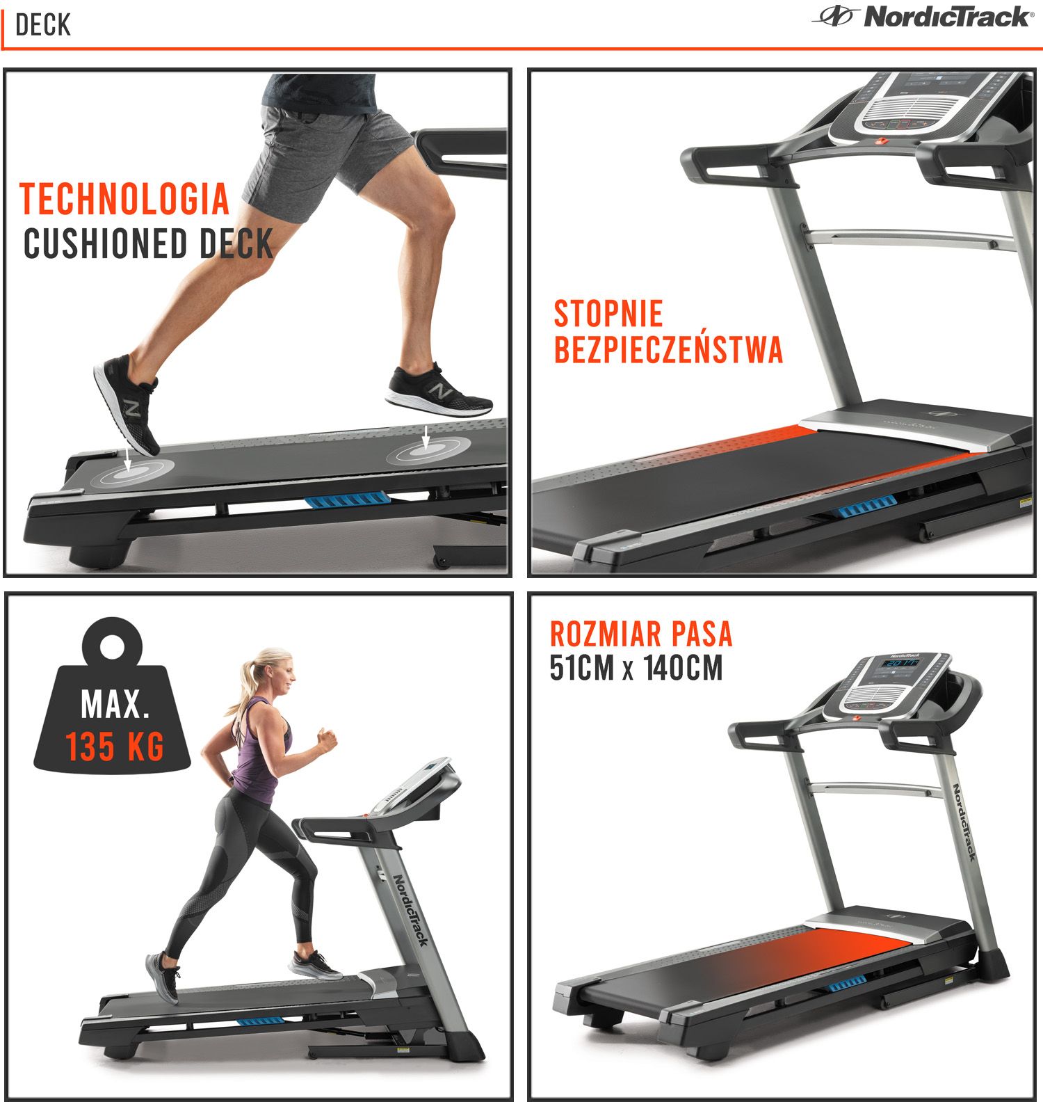 POWIERZCHNIA PASA BIEŻNI: Duży pas bieżni o wymiarach 51 x 140 cm (szer. x dł.) zapewnia większe bezpieczeństwo i komfort w trakcie biegu.