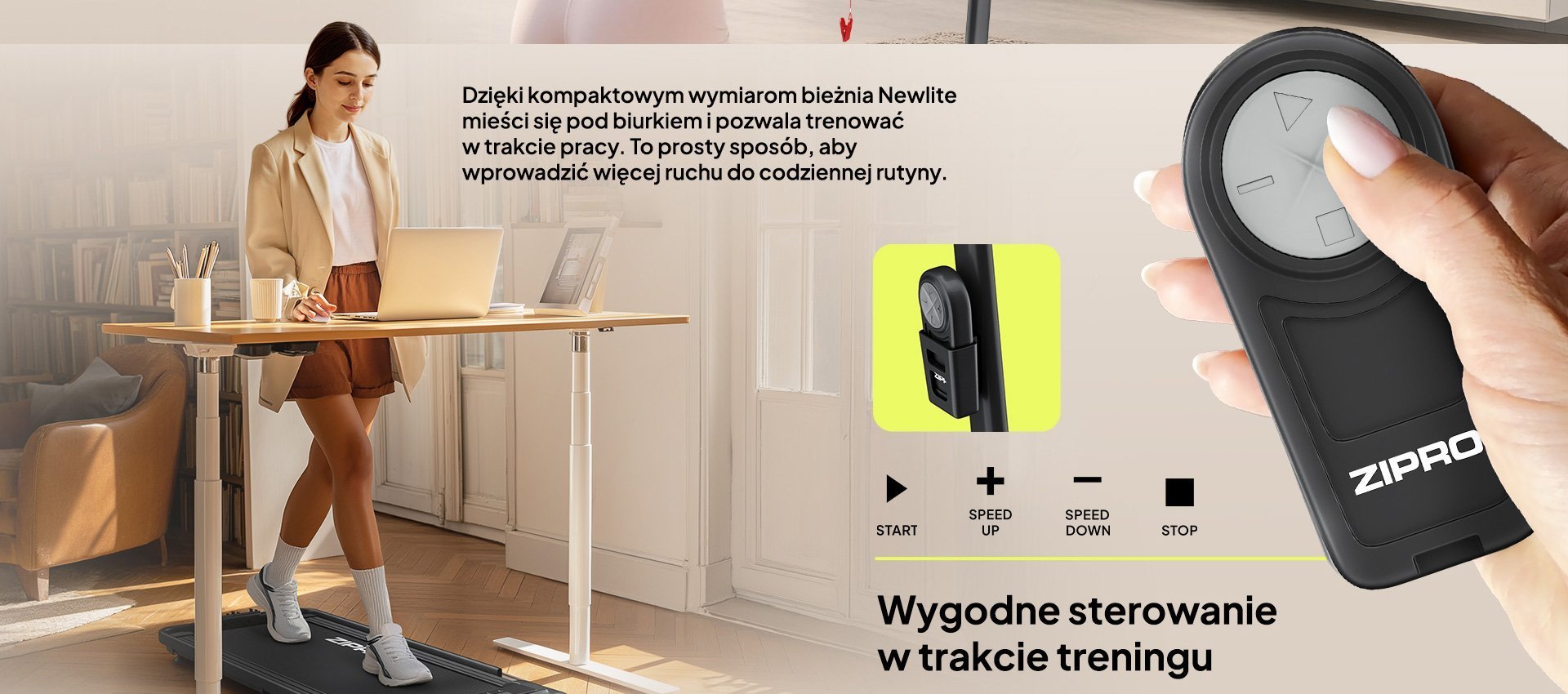 ZIPRO Newlite to idealne rozwiązanie dla osób, które chcą zadbać o kondycję bez rezygnowania z obowiązków. Dzięki możliwości złożenia uchwytu bieżnia z łatwością zamienia się w kompaktowe urządzenie do chodzenia podczas pracy– wystarczy wsunąć ją pod biurko i zacząć się ruszać. To świetny sposób, by spalić kalorie, poprawić krążenie i zwiększyć energię, nie przerywając pracy zdalnej czy spotkań online.