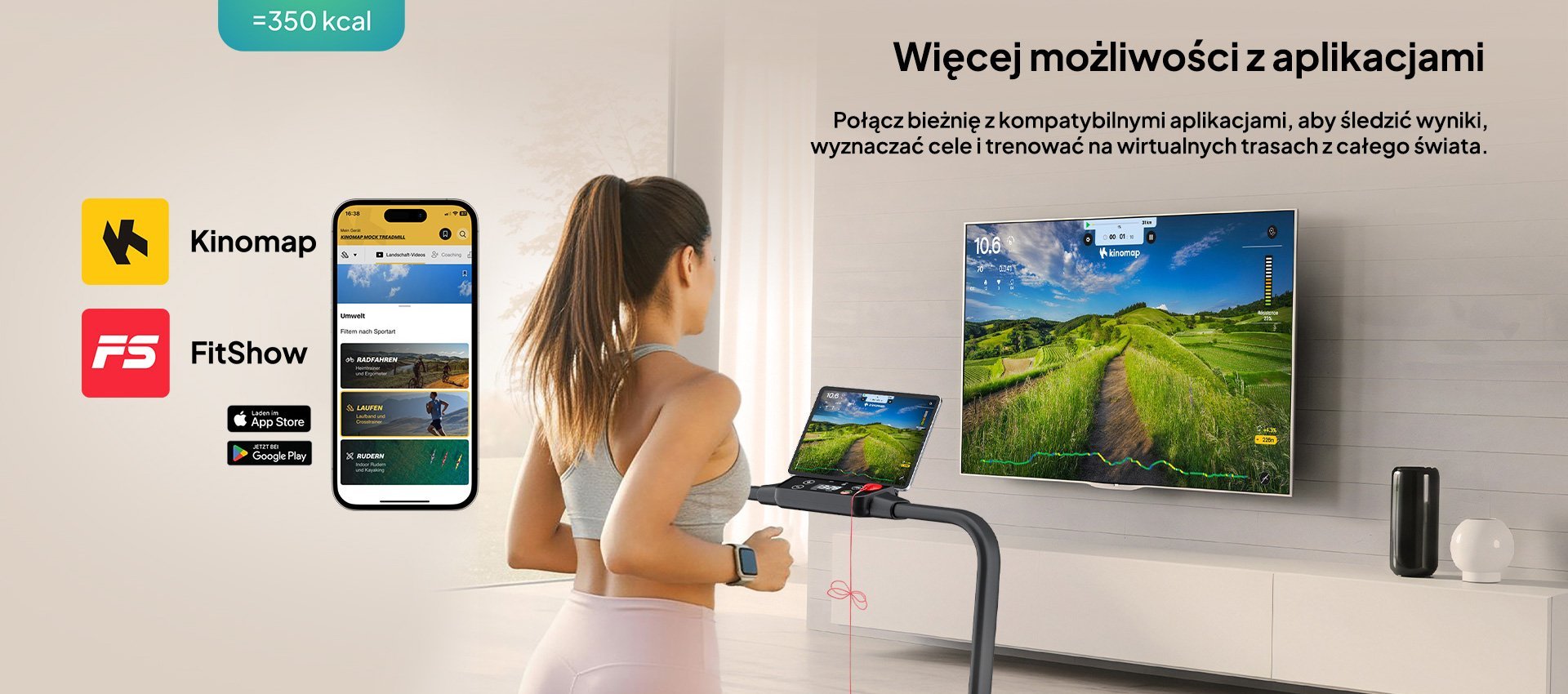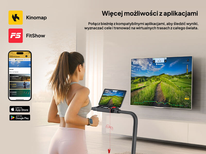 Otwórz się na więcej – trening z aplikacjami FitShow i Kinomap Bieżnia ZIPRO Newlite to nie tylko solidny sprzęt do codziennego treningu – to również wrota do cyfrowego świata aktywności fizycznej. Dzięki kompatybilności z aplikacjami, każdy bieg może stać się znacznie bardziej angażujący, zróżnicowany i motywujący. Aplikacja FitShow pozwala monitorować postępy, ustawiać cele treningowe, korzystać z map i wirtualnych tras oraz dzielić się wynikami. Jeśli klasyczny trening Cię nudzi, Kinomap zamieni Twój bieg w podróż dookoła globu, dzięki setkom realistycznych tras.