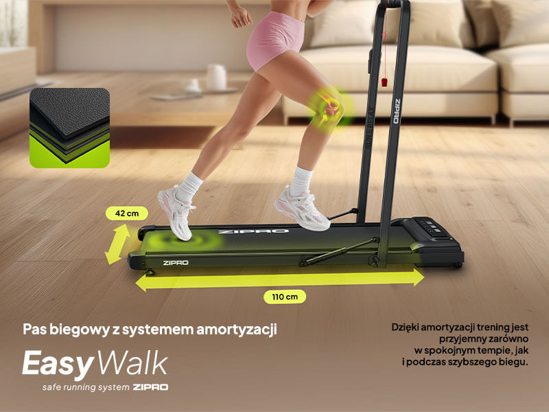 Pas bieżni ZIPRO Newlite o wymiarach 40 x 120 cm zapewnia wygodną i stabilną przestrzeń do chodzenia oraz biegania – nawet przy dłuższych krokach. To idealne rozwiązanie zarówno dla początkujących, jak i bardziej zaawansowanych użytkowników, którzy cenią sobie swobodę ruchu. Dodatkowo, system amortyzacji skutecznie tłumi wstrząsy, chroniąc stawy i zwiększając komfort każdego treningu. Dzięki temu możesz ćwiczyć dłużej i częściej – bez obciążania kolan i kostek.