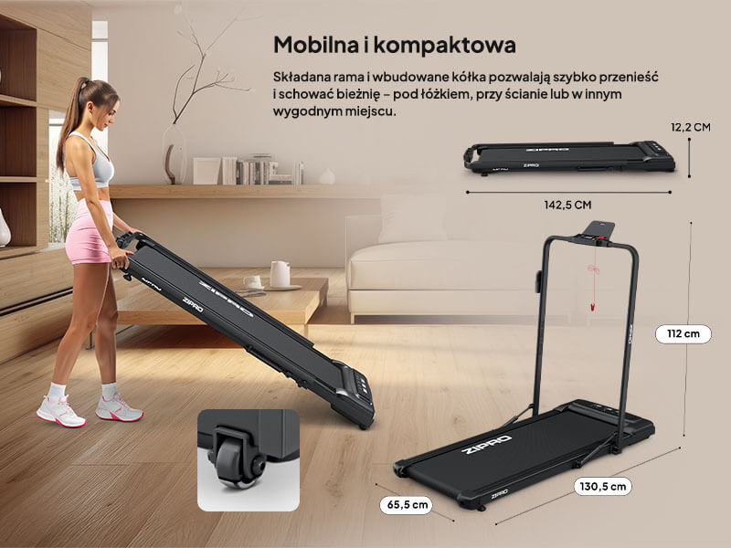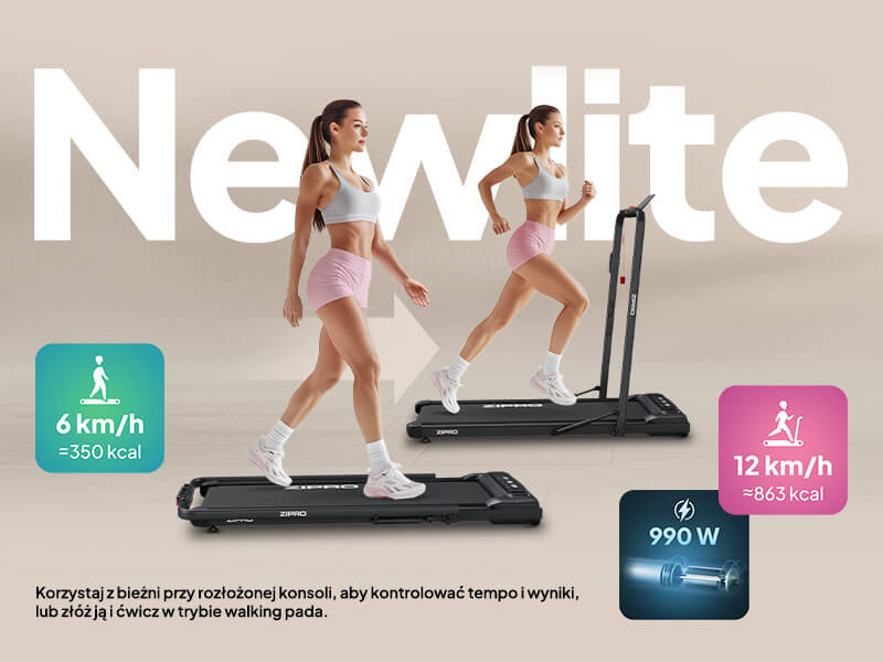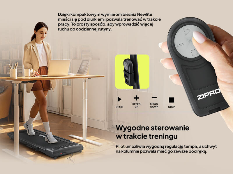 ZIPRO Newlite to idealne rozwiązanie dla osób, które chcą zadbać o kondycję bez rezygnowania z obowiązków. Dzięki możliwości złożenia uchwytu bieżnia z łatwością zamienia się w kompaktowe urządzenie do chodzenia podczas pracy– wystarczy wsunąć ją pod biurko i zacząć się ruszać. To świetny sposób, by spalić kalorie, poprawić krążenie i zwiększyć energię, nie przerywając pracy zdalnej czy spotkań online.