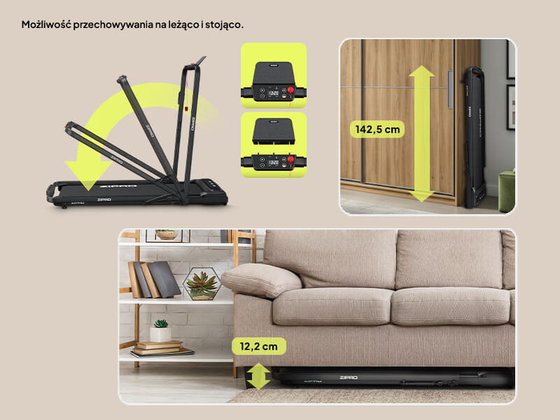 ZIPRO Newlite to wybór wygodnego przechowywania i komfortowych ćwiczeń. Jeśli jesteś miłośnikiem oszczędzania miejsca, a Twoja domowa siłownia nie ma swojej wydzielonej przestrzeni – ta bieżnia to idealna maszyna dla Ciebie! Bieżnia składana ZIPRO Newlite ma tylko 17 cm wysokości po złożeniu, co sprawia, że urządzenie możesz z powodzeniem przechowywać nawet pod łóżkiem. Dodatkowo pokrętło blokujące uniemożliwia przypadkowe złożenie maszyny, co sprawia, że całość jest naprawdę bezpieczna.