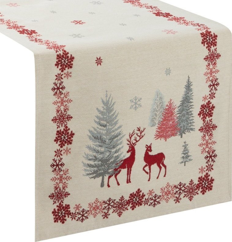 Piękny bieżnik świąteczny biały z czerwonymi motywami ośnieżonego lasu, zwierząt oraz gwiazdek. Wykonany z poliestru. Wspaniały dodatek do uroczystego wystroju mieszkania. Razem z obrusem TOVAGLIA będzie stanowił komplet.