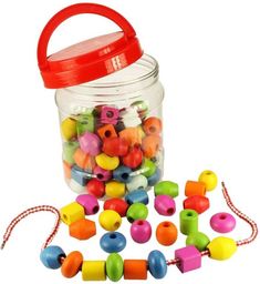 Całość wykonana z drewna lakierowanego i zapakowana w plastikowe wiaderko. Koraliki wpięciu kształtach oraz sześciu tęczowych kolorach.