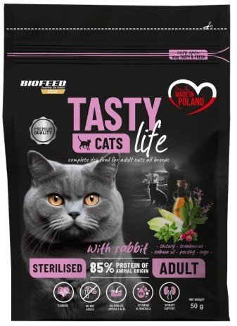 BIOFEED TASTY CATS LIFE STERILISED WITH RABBIT to doskonała karma, stworzona z myślą o kotach po sterylizacji. Dzięki starannie dobranym składnikom, ten produkt zapewnia Twojemu pupilowi zdrowe i smaczne odżywianie, które wspiera jego kondycję oraz samopoczucie.