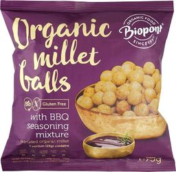 Składniki: proso łuszczone*, olej słonecznikowy*, mieszanka przypraw Barbecue* (7,1%) (surowy cukier trzcinowy*, przyprawy* (czerwona papryka kalifornijska w proszku*, cebula w proszku*, czosnek w proszku*, pieprz czarny*, ocet w proszku*, mąka ryżowa*, pomidor w proszku*, ekstrakt drożdżowy), sól morska. Opis: Bezglutenowe chrupki jaglane o smaku barbecue. Idealna zdrowa przekąska. Wartość odżywcza w 100 g : Wartość energetyczna: 1820 kJ / 435 kcalTłuszcz: 18 gW tym kwasy tłuszczowe nasycone: 1,9 g, Węglowodany: 55 gW tym cukry: 7,5 gBłonnik: 9,2 g, Białko: 9,4 g, Sól: 0,95 g Informacja alergenna: Może zawierać mleko (łącznie z laktozą) i orzechy ziemne Zalecane warunki przechowywania: Przechowywać w suchym i chłodnym miejscu.Cechy produktu: Certyfikat BIOtakBez glutenutakWegetariańskitakWegańskitakKraj producentaWęgryKraj pochodzenia składników
