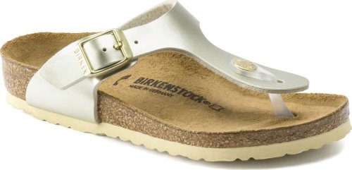 Model BIRKENSTOCK Gizeh to prawdziwa klasyka gatunku, która łączy w sobie doskonałe dopasowanie oraz modny design i nie bez powodu przyciąga na siebie spojrzenia. Tym razem sandały prezentują się w zupełnie nowej odsłonie: w ekstrawaganckim, elektryzująco-metalicznym wzornictwie. Odbijająca światło folia nadaje naszemu klasykowi nowego blasku i sprawia, że buty doskonale uzupełnią każdą stylizację. Wyrafinowany wygląd buta dopełniają idealnie dopasowana kolorystycznie podeszwa i sprzączki. Materiał wierzchni tworzy przyjazne dla skóry, wytrzymałe tworzywo syntetyczne Birko-Flor®.