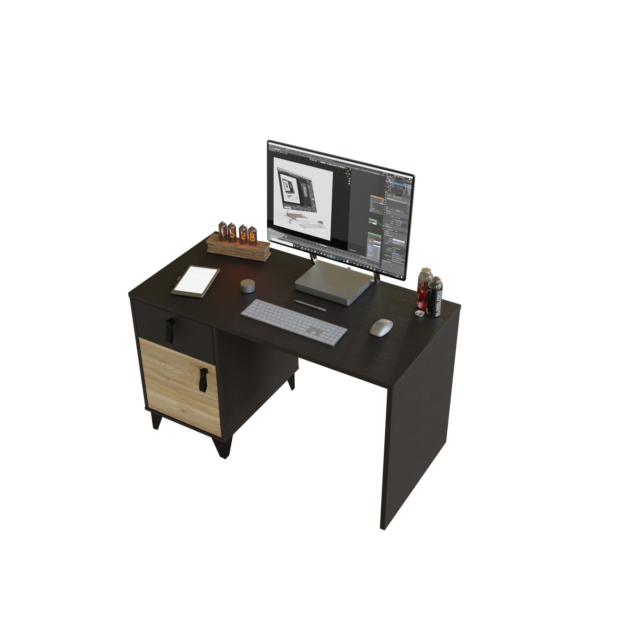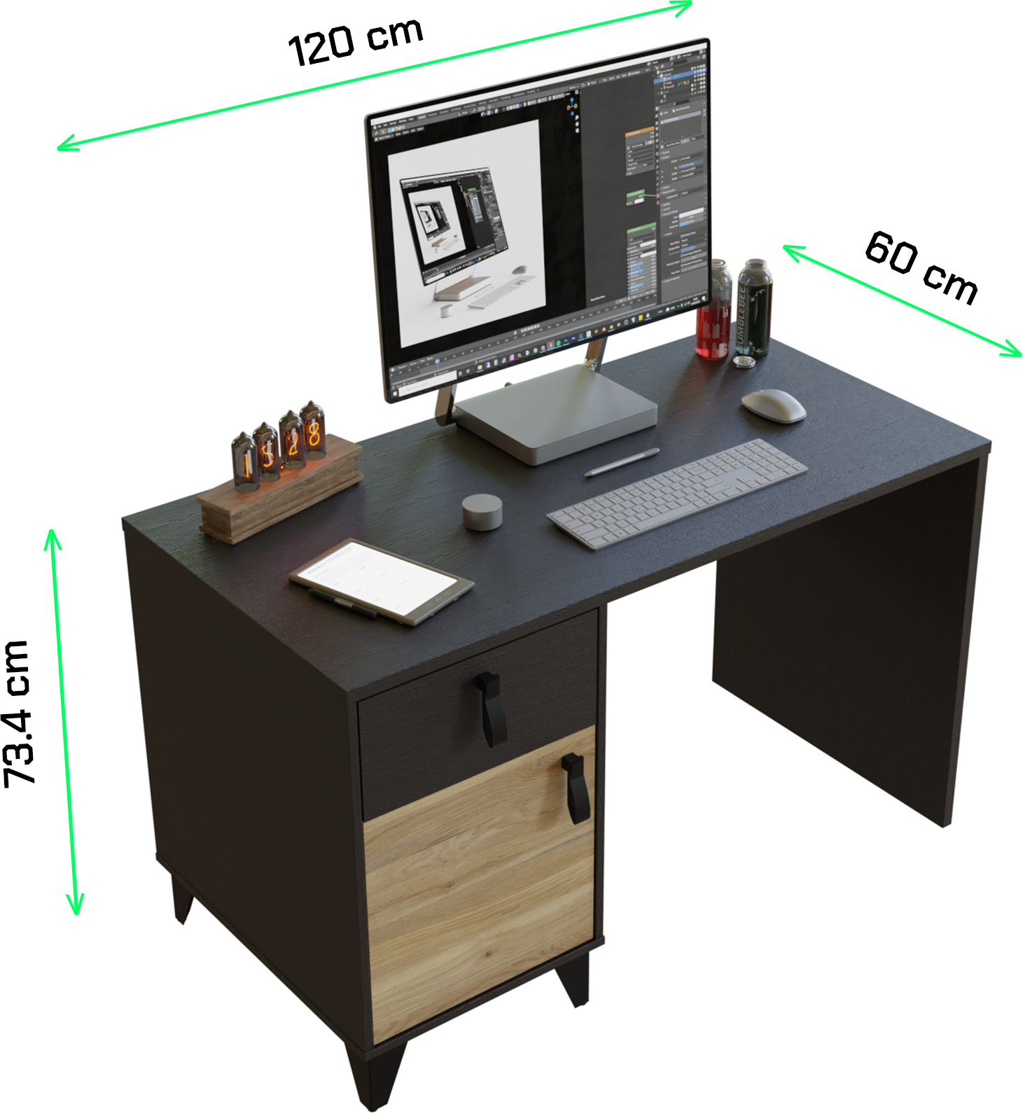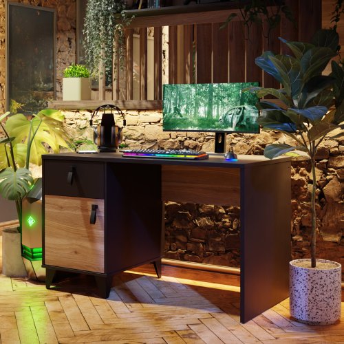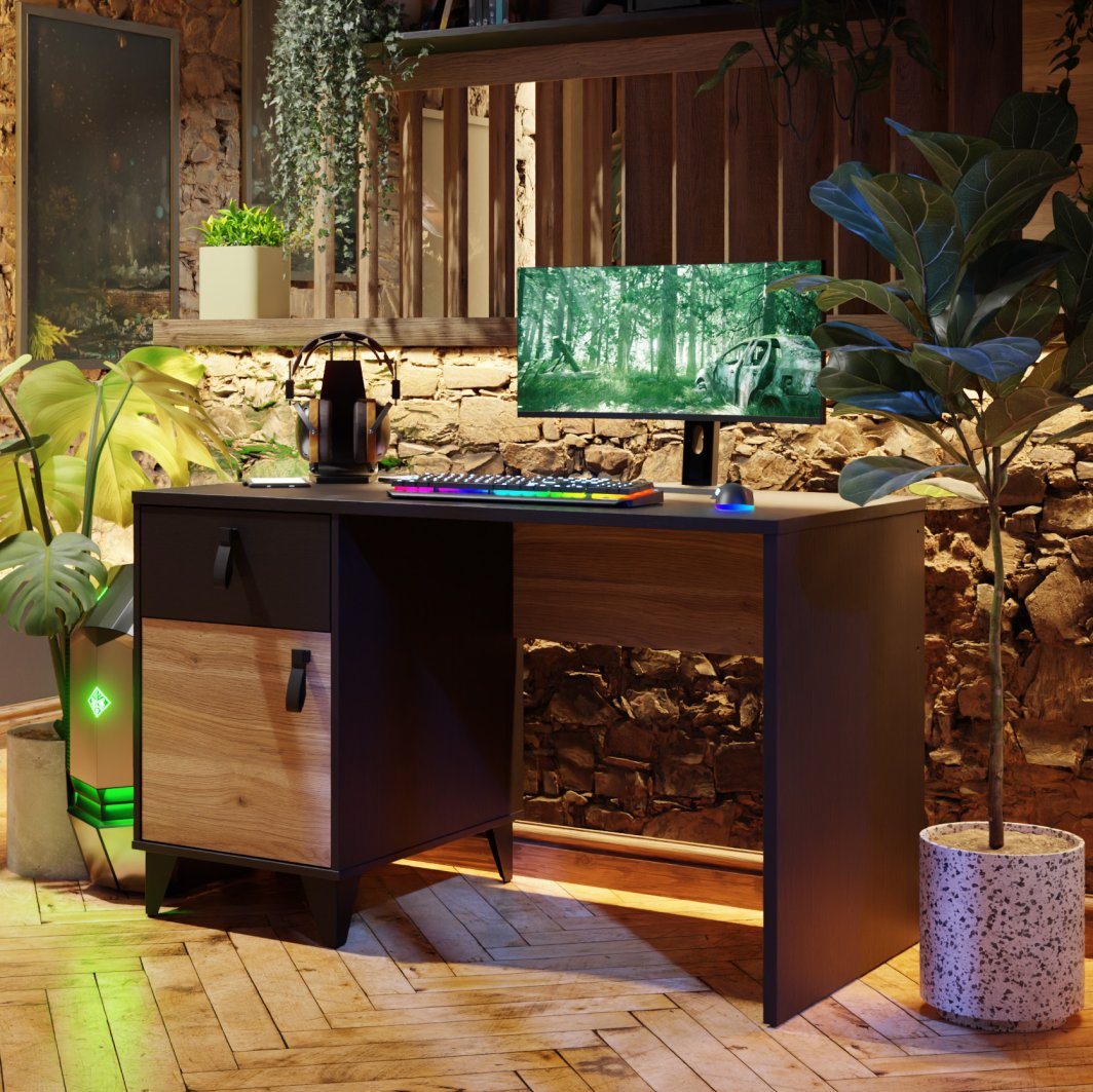 Biurko w odcieniu czerni i drewna, dzięki 120 cm blatowi, zapewnia wysoki komfort eksploatacji i solidną podstawę do pracy oraz rozrywki. Szafka ułatwi organizację i zachowanie porządku, a w szufladzie przechowasz gry lub akcesoria, które nie są aktualnie używane.
