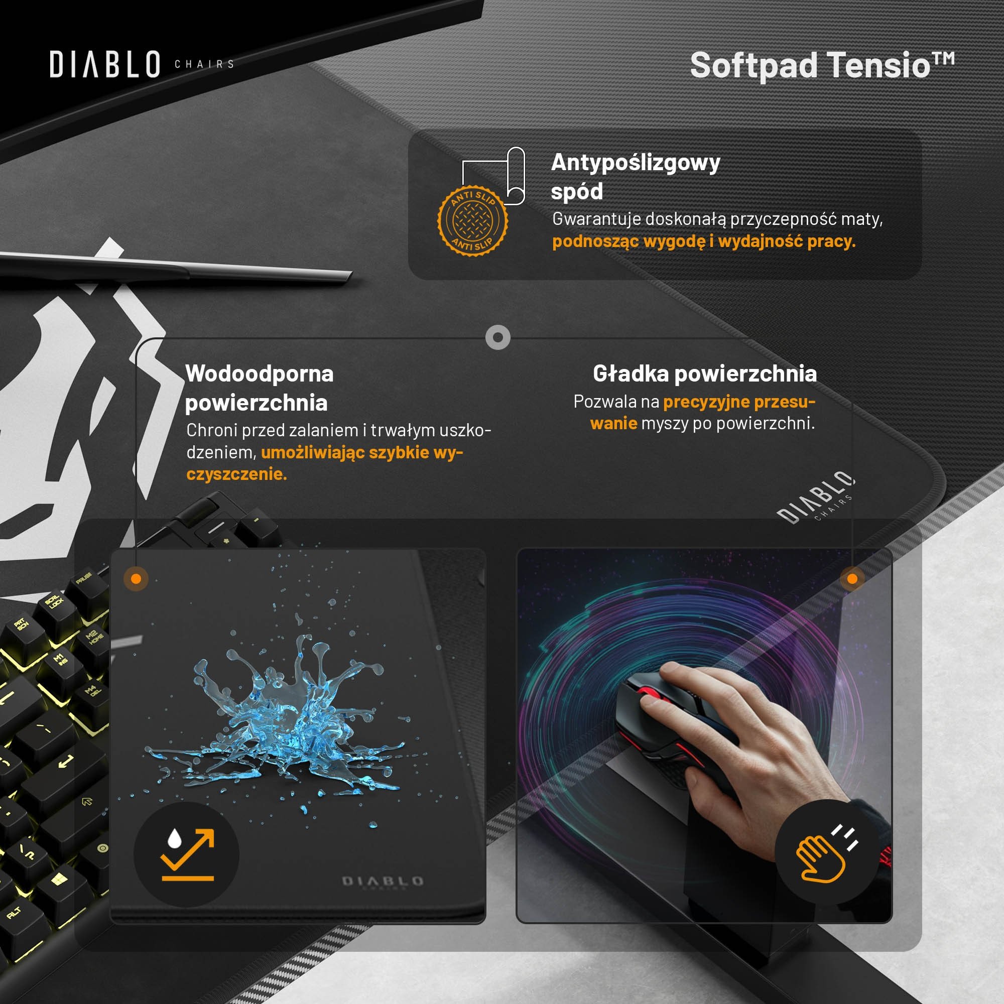 Blat biurka X-Tensio 1100 jest wyjątkowo pojemny i pomieści wszystko, co niezbędne do skutecznego działania. Kompaktowe wymiary oznaczają dużą swobodę przy ustawianiu biurka i aranżacji pomieszczenia. Mata Diablo Chairs nadaje drapieżnego charakteru i pomaga w działaniu. Gładka powierzchnia maty ułatwia ruch myszki – nie potrzebujesz już żadnej podkładki. Antypoślizgowy spód maty gwarantuje idealną przyczepność do blatu, a wodoodporne właściwości umożliwiają zachowanie czystego biurka.
