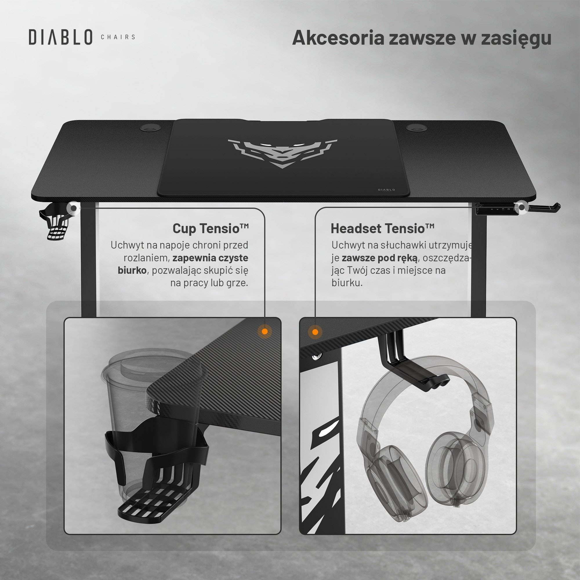 W biurku Diablo X-Tensio nie mogło zabraknąć zamontowanych uchwytów na kubek i słuchawki. Ulubione akcesoria masz zawsze blisko siebie na wyciągnięcie ręki, bez obaw o przypadkowe rozlanie napoju i uszkodzenie sprzętów. Nie tracisz też cennego miejsca na biurku.