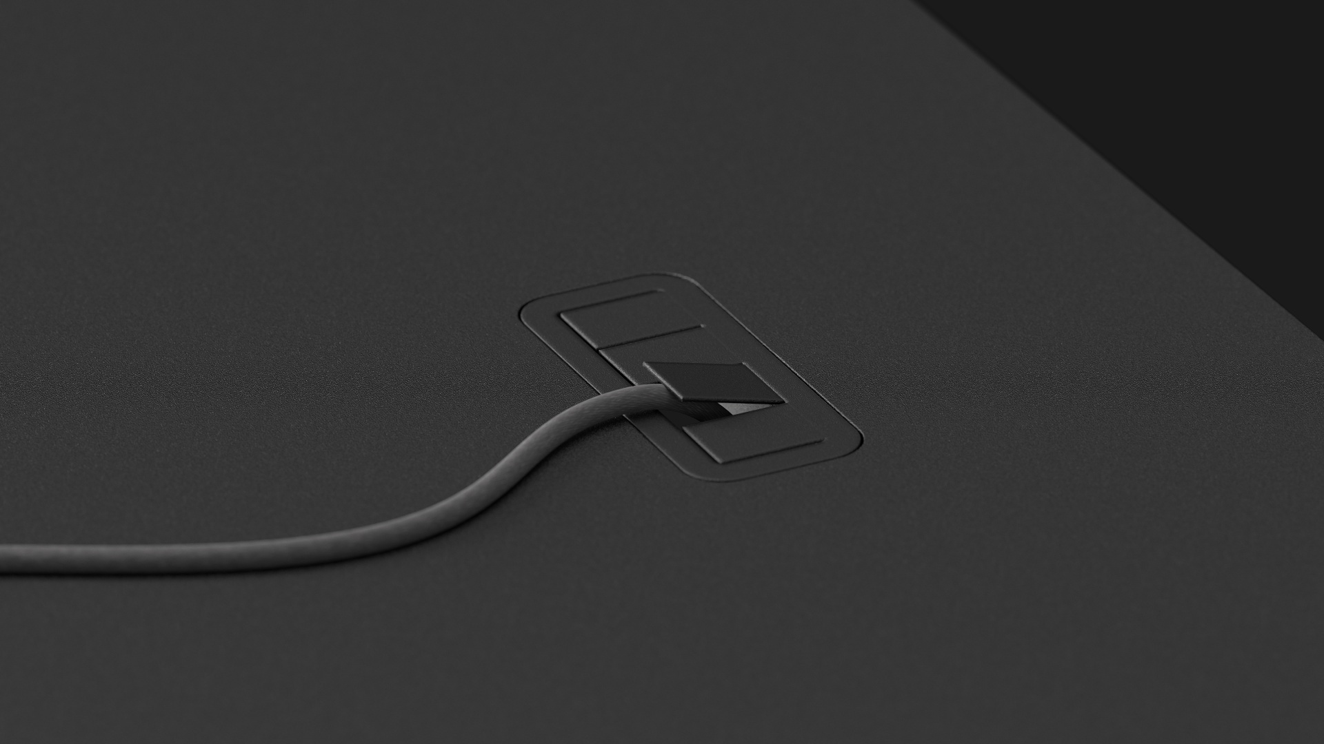 Starannie wkomponowana w blat przelotka na kable ułatwia organizację przestrzeni roboczej i zarządzanie kablami. Przepust jest idealnie płaski i gumowany, dzięki czemu nie wpływa na ustawność biurka. To subtelne rozwiązanie, które robi ogromną różnicę – minimalna forma, maksymalna funkcjonalność.