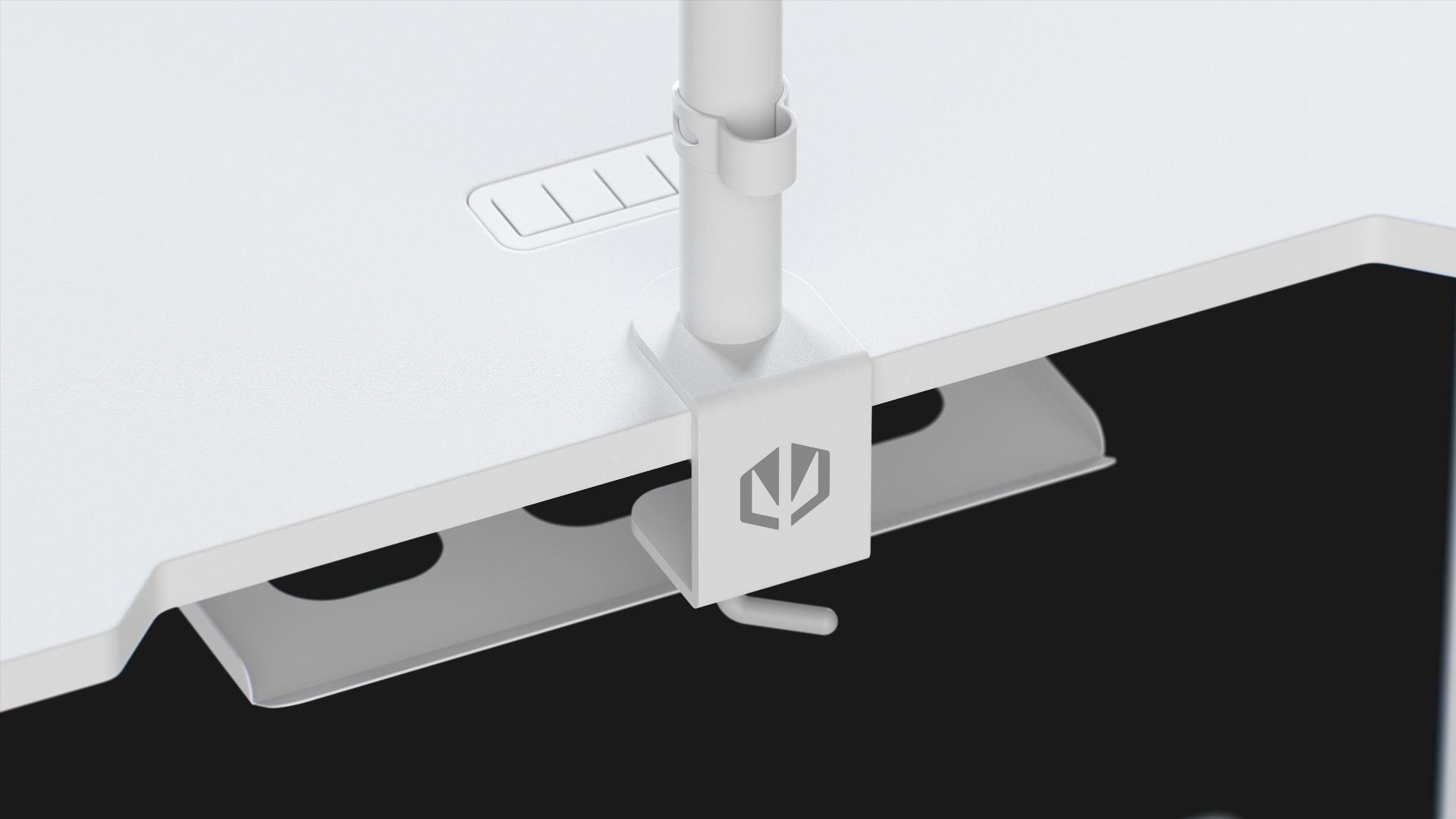 W tylnej krawędzi blatu znajduje się precyzyjnie frezowane wcięcie, które umożliwia bezpieczne i estetyczne zamontowanie uchwytu na monitor i poprowadzenie dodatkowych przewodów – bez uszczerbku dla ściany. W połączeniu z dyskretnie ukrytą pod blatem półką na listwę zasilającą pozwala to na skuteczne schowanie kabli i zapobiega ich plątaniu.