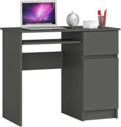 Biurko wolnostojące PIKSEL 90 cm w kolorach GRAFIT SZARY jest idealnym rozwiązaniem dla małych wnętrz. Bardzo dobrze sprawdzi się w roli biurka szkolnego lub komputerowego. Jego ergonomiczna konstrukcja zapewnia komfort użytkowania. Biurko zostało wyposażone w wysuwaną półkę na klawiaturę, podręczną szufladę boczną oraz szafkę z półką, w której swobodnie mogą stanąć segregatory i książki. Do wykonania biurka użyto przyjemnej w dotyku i łatwej w utrzymaniu matowej płyty pokrytej odporną na ścieranie warstwą laminatu. Całości dopełniają poręczne uchwyty w srebrnym kolorze.