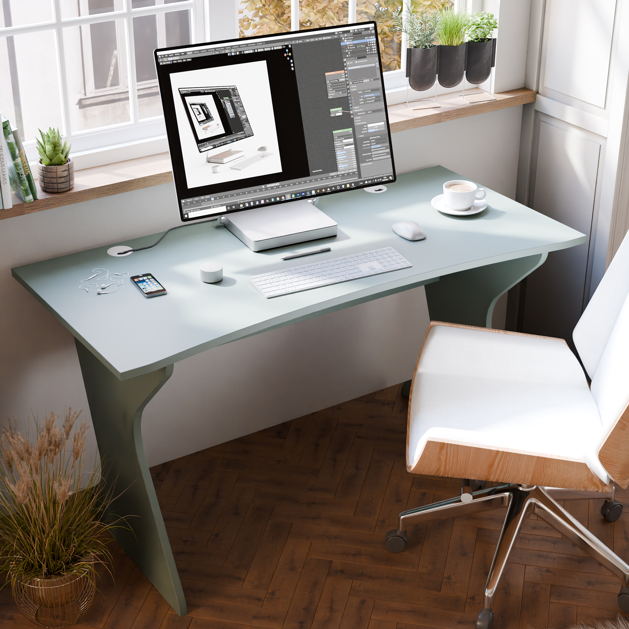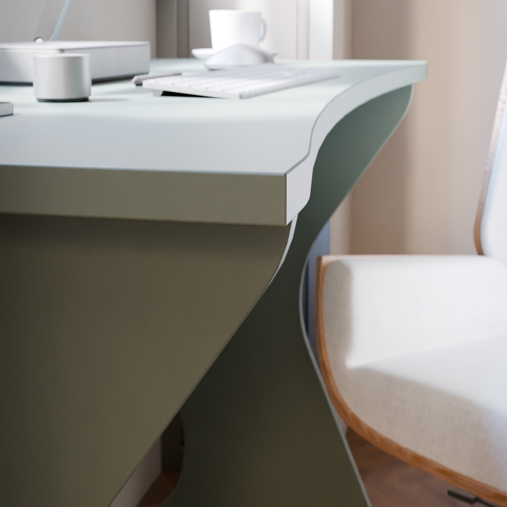 Blat biurka gamingowego BASESTAR202 w szałwii, pokryty laminatem i dodatkowo wzmocniony obrzeżami ABS, będzie bardziej odporny na codzienne zarysowania i łatwy do czyszczenia z plam.