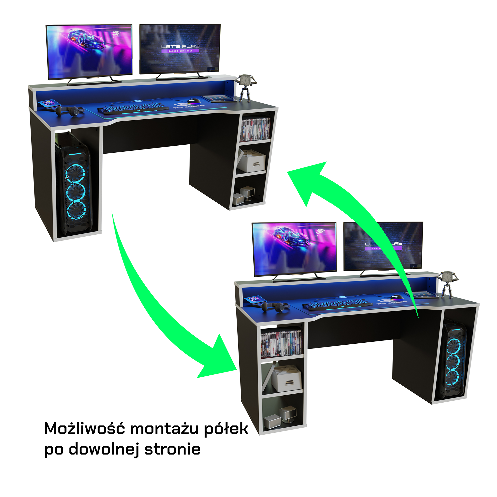 Razem z czarno-białym biurkiem SUPERNOVA211 zyskujesz wielokolorowe oświetlenie LED. Biorąc pod uwagę Twój komfort, w zestawie znajdziesz również pilot do sterowania oświetleniem, który pozwoli Ci wybrać idealny kolor i intensywność, które najbardziej Ci pasują. Jesteśmy pewni, że stworzysz wyjątkowy klimat zarówno do grania, jak i wieczornego oglądania filmów.