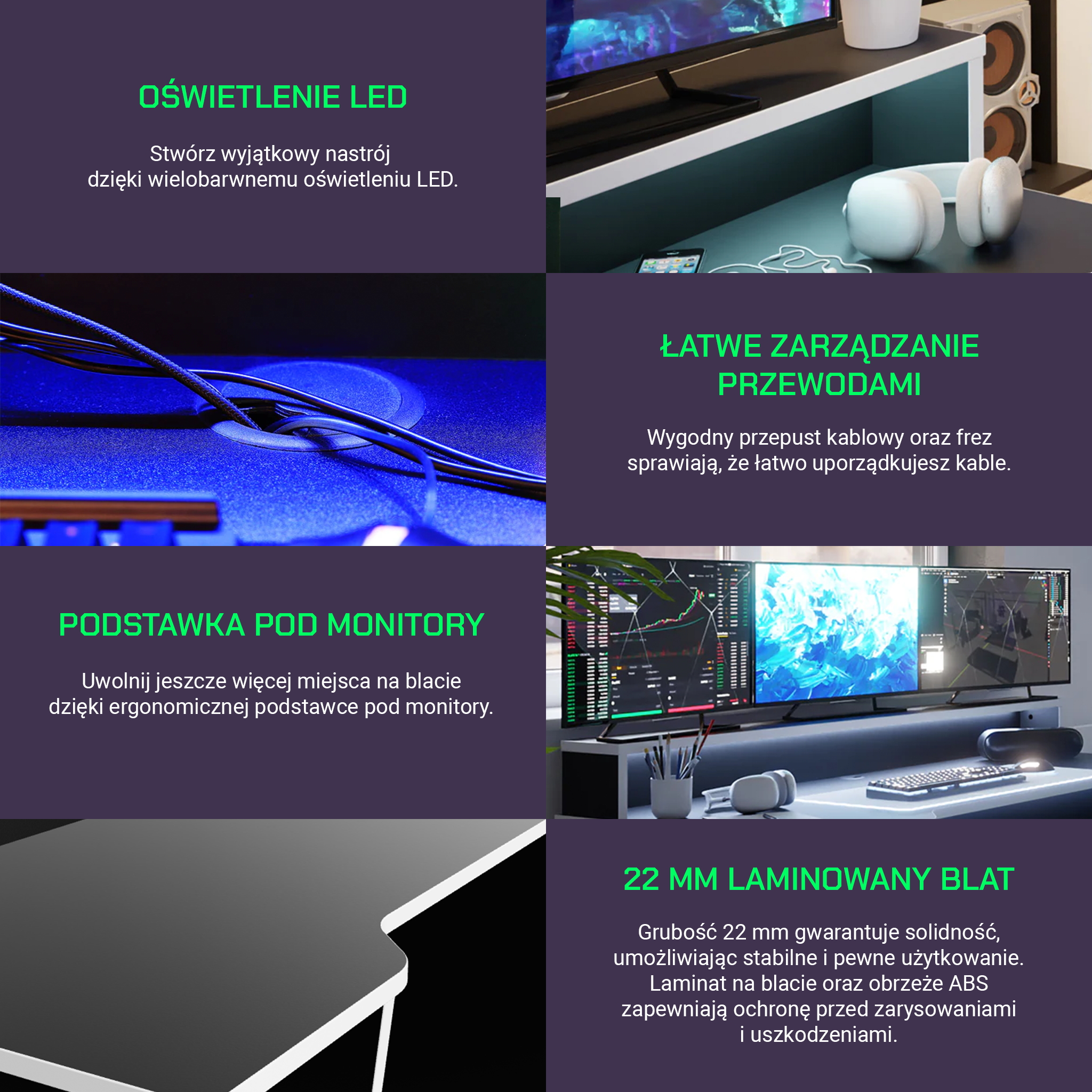 Chcemy, abyś czuł satysfakcję z zakupu i korzystania z czarno-białego biurka gamingowego SUPERNOVA211. Całość jest pokryta laminatem odpornym na zarysowania, co daje pewność jego długowieczności. Dodatkowo, białe krawędzie ABS nie tylko chronią przed odpryskami, ale również świetnie się prezentują.