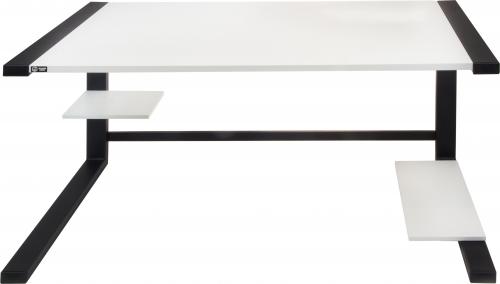 Jako gracze zaprojektowaliśmy stację roboczą w nowoczesnym, minimalistycznym stylu. Nie ma tu zbędnych ozdobników. Górna część to szeroki pulpit roboczy, który umożliwia zamontowanie monitora w zalecanej odległości od oczu. Pod nim znajduje się mała w pełni demontowalna półka, a niżej większa, gdzie postawisz swoją jednostkę centralną. Jest to półka otwarta, dzięki czemu zapewnia komputerowi odpowiedni przepływ powietrza. Całość wspiera się na wykonanych z wysokiej jakości stalowych wspornikach.