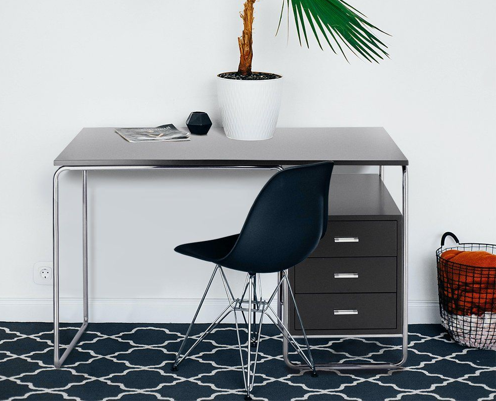 Biurko biurowe w stylu modern doskonale wygląda w eleganckich, minimalistycznych wnętrzach. Prosty blat i chromowane elementy biurka będą doskonale współgrać z nowoczesnym krzesłem biurowym ze skóry i lampą architekta.