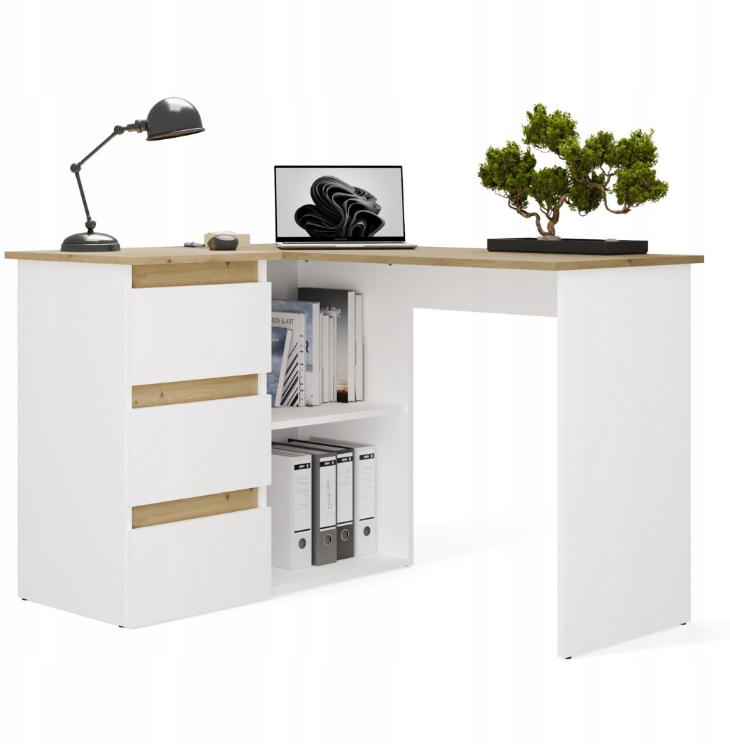 Biurko NICEA LEWE ARTISAN BIEL to nowoczesne biurko narożne, które harmonijnie łączy funkcjonalność z estetyką. Wykonane w eleganckim białym kolorze z blatem w odcieniu dębu artisan, doskonale wkomponowuje się w różnorodne aranżacje wnętrz. Dzięki minimalistycznej formie oraz przemyślanej konstrukcji, biurko zapewnia komfort użytkowania, co czyni je idealnym rozwiązaniem do pracy i nauki w domowym biurze.