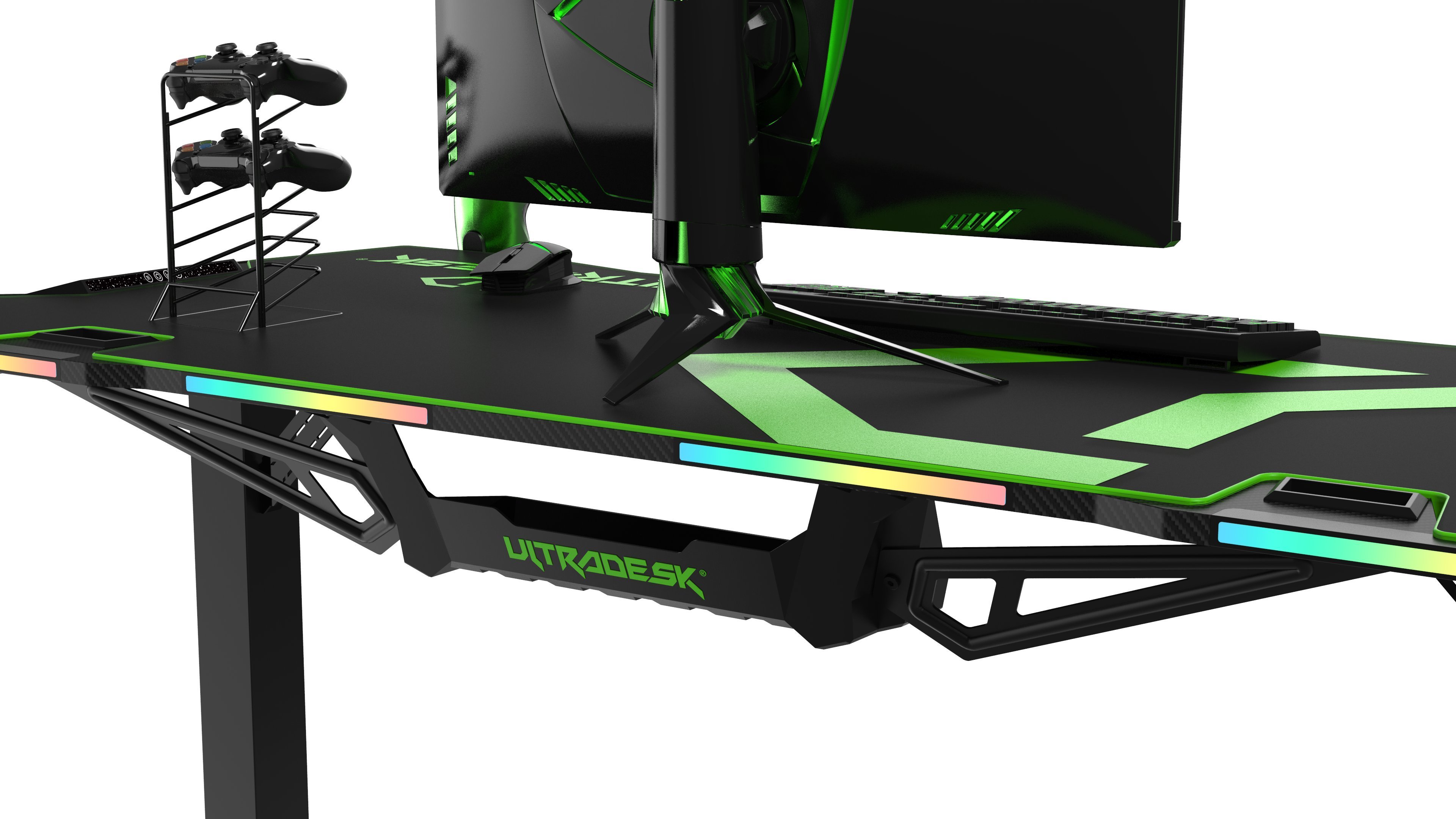 Najnowsza, rozszerzona wersja naszego autorskiego podświetlenia LED RGB PRISMATIC. Elementy podświetlenia zainstalowano w długich panelach po bokach pulpitu oraz w trzech panelach zlokalizowanych wewnątrz krawędzi tylnej, które odpowiadają za podświetlenie ściany za biurkiem. 22 odrębne tryby specjalne ze zdumiewającymi efektami. Podświetlenie korzysta z zasilania dostarczanego poprzez port USB.