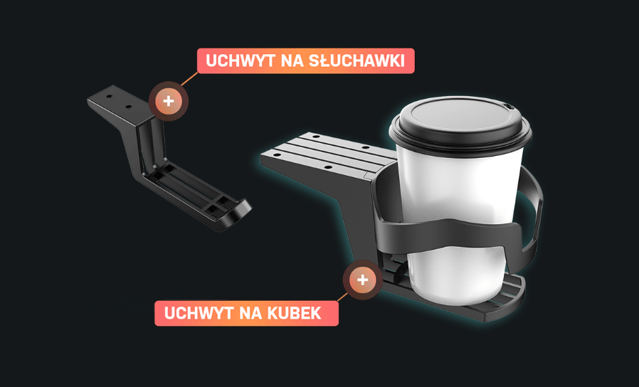 Biurko komputerowe musi oferować szeroki wachlarz przydatnych akcesoriów. Po lewej stronie pulpitu pod krawędzią przednią możecie zainstalować uchwyt na napoje oraz uchwyt na słuchawki (zawarte w zestawie). Oba te rozszerzenia nie są jedynie ozdobą – większość użytkowników korzysta z nich codziennie.