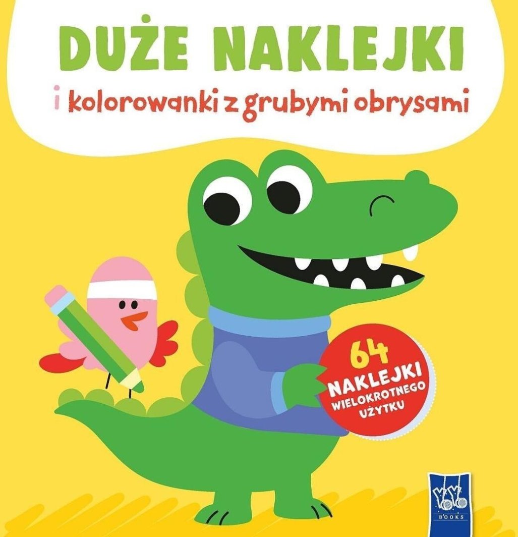 Duże naklejki wielokrotnego użytku urozmaicą zabawę. Naklejka w dolnym rogu na każdej stronie przedstawia obiekt, na którym maluszek może się wzorować, kolorując rysunek.