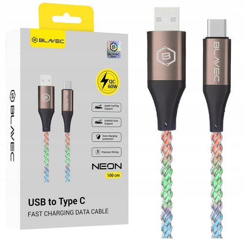 Kabel Blavec USB typ C to innowacyjne rozwiązanie dla tych, którzy cenią sobie szybkość, trwałość oraz estetykę. O długości 1 metra, ten wielokolorowy kabel łączy w sobie efektowny design LED z wydajnym ładowaniem do 60W w technologii Quick Charge. Doskonale sprawdzi się w codziennym użytkowaniu, oferując nie tylko funkcjonalność, ale także styl.