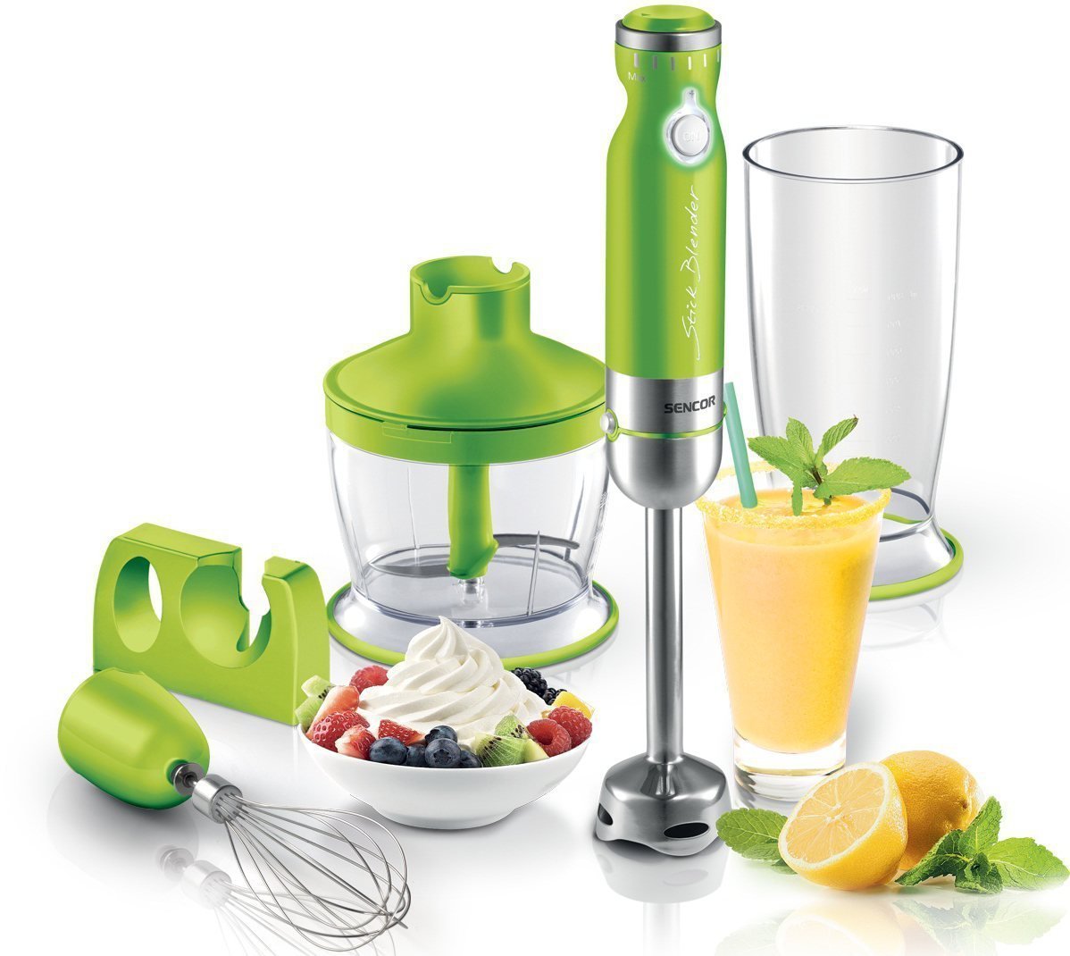 Blender ręczny SHB 4362GR marki Sencor, w kolorze zielono-srebrnym, wyposażony został w płynną regulację prędkości, nóż ze stali nierdzewnej, wieszak oraz uchwyt ścienny. Posiada on przycisk zasilania z podświetleniem oraz przycisk zwalniający nasadki. Ponadto posiada moc 800 W, bardzo cichy silnik zasilany prądem stałym z gwarancją na 6 lat.