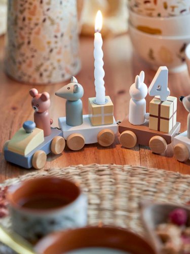 Dekoracja urodzinowa Junaid od Bloomingville MINI to niezwykły element, który sprawia, że świętowanie urodzin staje się jeszcze bardziej niezapomniane. Ta radosna kolejka urodzinowa składa się z pięciu uroczych wagoników, w których umieszczono kolorowe prezenty oraz zwierzęta, doskonale wpisujące się w wesoły klimat urodzinowego przyjęcia.