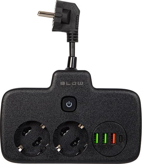 Przedłużacz sieciowy BLOW w kolorze czarnym z dwoma gniazdami przeznaczony do użytku domowego. Przedłużacz pozwala podłączyć urządzenia, które są oddalone od gniazda elektrycznego. Produkt z jednej strony posiada 2 gniazda obróconych pod kątem oraz włącznik, a z drugiej pojedynczy kątowy wtyk sieciowy.