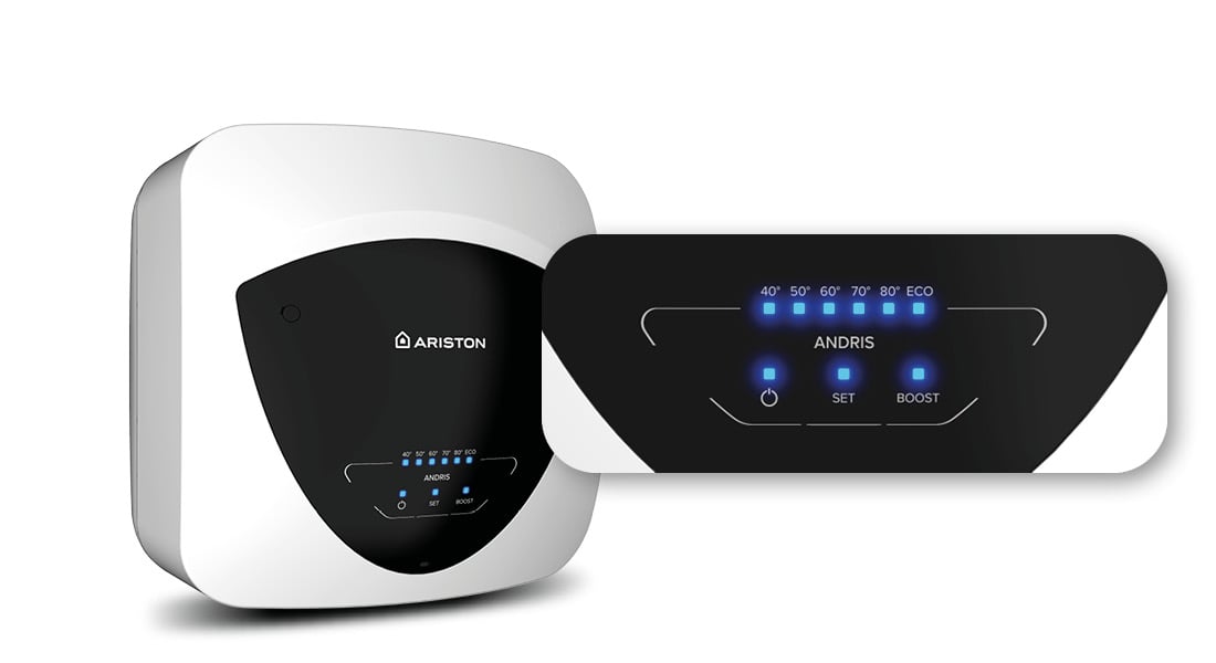 Mały bojler Andris Elite wyposażono w intuicyjny panel sterowania, który ułatwia codzienną obsługę. Wyraźne, podświetlane wskaźniki umożliwiają precyzyjne ustawienie temperatury wody w zakresie od 40°C do 80°C, a tryb ECO optymalizuje zużycie energii. Funkcja "Boost" pozwala na szybkie podgrzanie wody, a czytelnie oznaczone przyciski "SET" i "BOOST" gwarantują wygodę użytkowania.