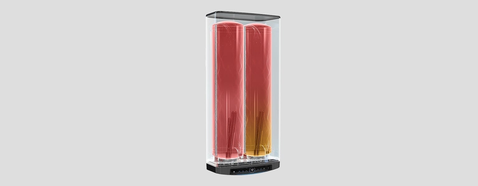 Technologia podwójnego zbiornika gwarantuje szybkie nagrzewanie wody oraz minimalizację strat ciepła, co zwiększa dostępność ciepłej wody i poprawia efektywność energetyczną.