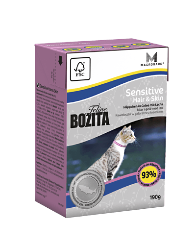 Bozita Feline Funktion™ Sensitive hair & skin, kawałki w galaretce ze świeżym łososiem skandynawskim jest odpowiednia dla kotów długowłosych i kotów o wrażliwej skórze i okrywie włosowej.