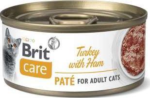 BRIT CARE CAT TURKEY PATÉ WITH HAM Karma uzupełniająca superpremium, mokra, dla dorosłych kotów, z indykiem i szynką. Nie zawiera soi, cukru, glutenu, GMO, barwników, konserwantów i środków aromatyzujących.