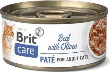 BRIT CARE CAT BEEF PATÉ WITH OLIVES Karma uzupełniająca, superpremium, mokra, dla dorosłych kotów z wołowiną i oliwkami. Nie zawiera soi, cukru, glutenu, GMO, barwników, konserwantów i środków aromatyzujących.
