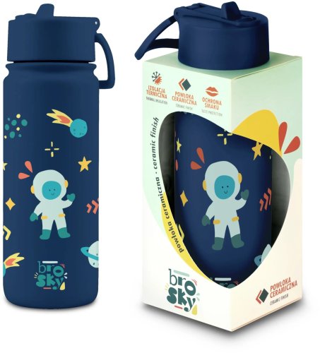Granatowa butelka na wodę Brosky Kids o pojemności 550 ml, ozdobiona motywem kosmosu, to znakomity wybór dla dzieci, które potrzebują funkcjonalnego i stylowego akcesorium do picia. Jej wyjątkowy design nie tylko spełnia praktyczne potrzeby, ale także przyciąga uwagę najmłodszych swoją estetyką.