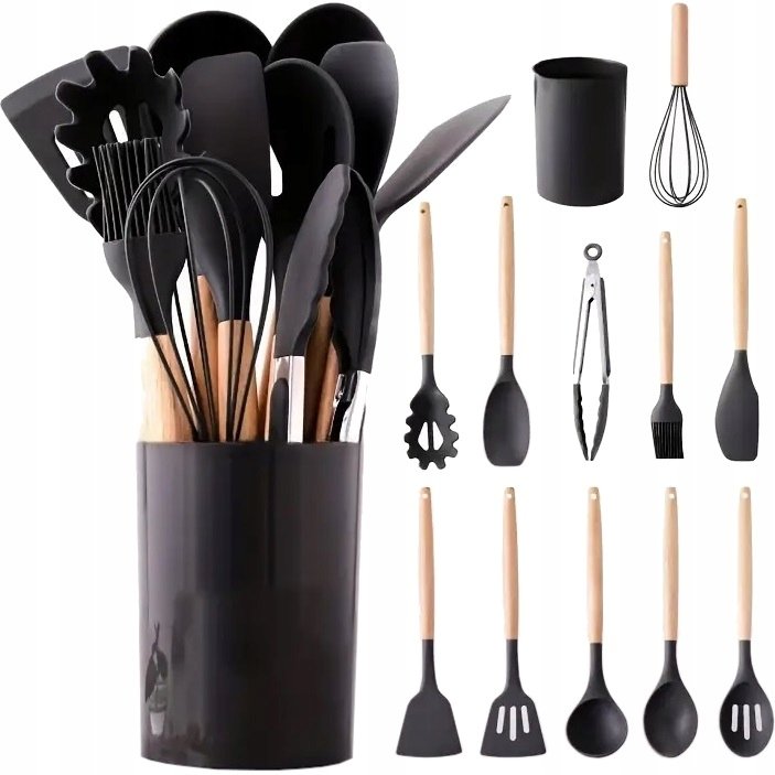 Przybory w eleganckim czarnym kolorze z drewnianymi rączkami doskonale wkomponują się w każdy wystrój kuchni. Nowoczesny design sprawia, że zestaw nie tylko spełnia swoje funkcje, ale również stanowi stylowy element dekoracyjny.