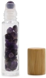 Butelka na olejek – Ametyst. Wymiary 8,7 x 2 cm. Szklana buteleczka typu roll on o pojemności 5 ml zawierająca kamienie szlachetne – Ametyst. Każda zwieńczona jest gładko wypolerowaną kulką (również z kamienia naturalnego!), która ułatwi równomierne nakładanie olejku oraz daje uczucie chłodu.