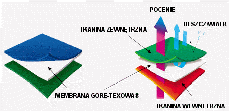 GORE-TEX® jest bardzo lekką i cienką membraną umieszczaną pomiędzy materiałem wierzchnim a podszewką. Rzeczy zawierające membranę GORE-TEX® są całkowicie wodoszczelne, wiatroszczelne i równocześnie oddychające.