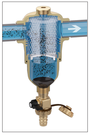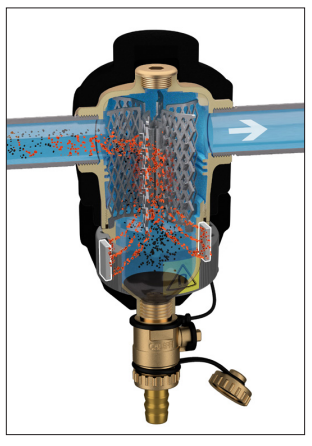 Zasada działania separatora zanieczyszczeń opiera się na połączeniu wielu zjawisk fizycznych. Wewnętrzny element (1) składa się z szeregu siatkowych powierzchni. Zanieczyszczenia zderzając się z powierzchnię elementu wewnętrznego są separowane z wody i opadają do dolnej części korpusu (2), gdzie są gromadzone. Duża objętość wewnętrzna urządzenia powoduje zmniejszenie prędkości przepływającej wody, co wspomaga separację zanieczyszczeń. Usuwanie zgromadzonych zanieczyszczeń można przeprowadzić przy normalnej pracy instalacji, w tym celu należy otworzyć zawór (3) znajdujący się w dolnej części urządzenia. Kierunek przepływu nie ma wpływu na prawidłową pracę separatora zanieczyszczeń.